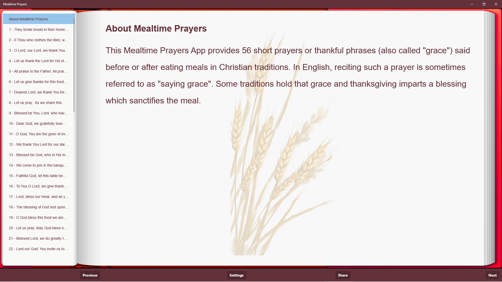 - Share button - for sending the selected Mealtime Prayer to Text Message, Mail, Facebook, etc